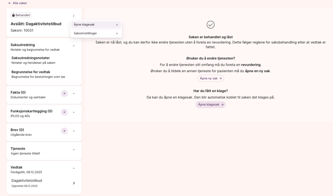 En sak må ha et ferdigstilt vedtak før du kan åpne klage. (Status: Behandlet og låst). Dette skjer automatisk når vedtaket er ferdigstilt. Er det en sak uten vedtak kan man manuelt markere saken som “behandlet og låst” for å få mulighet til å opprette en klage.
