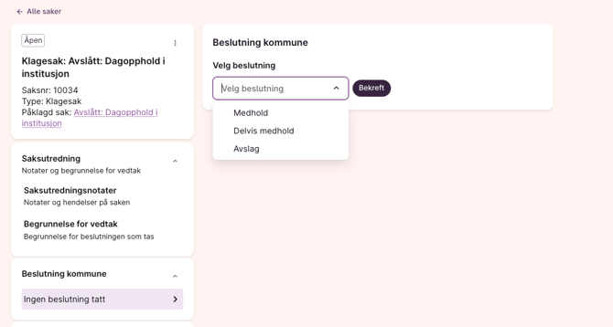 - Delvis medhold – klage delvis tatt til følge. Ved dette valget vil du både få forslag til å starte en revurdering dersom klagepart er enig, eller å starte på en oversendelse til statsforvalter dersom klagepart ikke er enig.