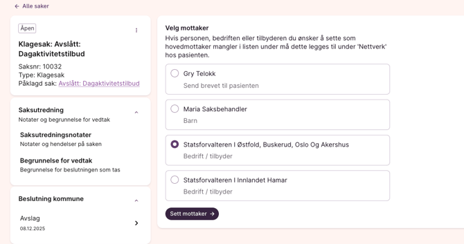 - Velg Statsforvalter som mottaker for brevet. Dersom Statsforvalter ikke dukker opp i listen, må Statsforvalter legges inn i kommunens SvarUt organisasjoner (Adminsitrasjon ⇒ Hele kommunen ⇒ Saksbehandling ⇒ Innstillinger) eller i pasientens nettverk under bedrifter / tilbydere. Se guide lenger nede på siden for detaljert flyt for å legge til Statsforvalter i kommunens nettverk.