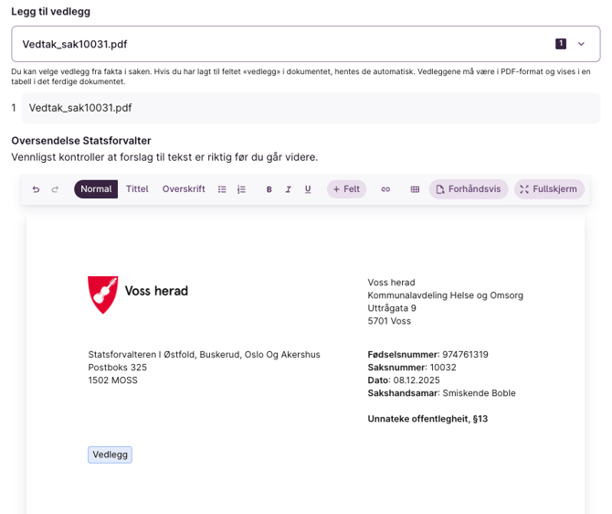 - Velg relevante dokumenter som skal legges ved som vedlegg i brevet til statsforvalter. Kun PDF dokumenter som ligger på saken kan legges til. Mangler du noen dokumenter må de legges til saken før de vil dukke opp som et valg som vedlegg. Dersom feltet