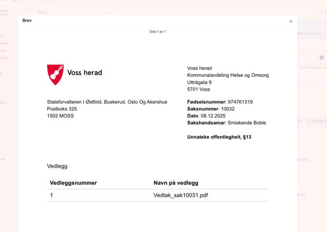 - Når oversendelsen til Statsforvalter er ferdigstilt, kan du sende brevet inkludert vedlegg via SvarUt, ved å trykke “Opprett SvarUt Forsendelse”.