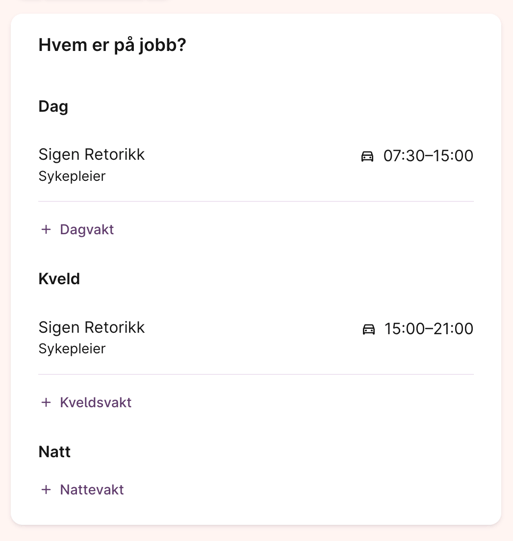 Har dere integrasjon mot turnussystem, hentes vakttidene automatisk – også for langvakter.