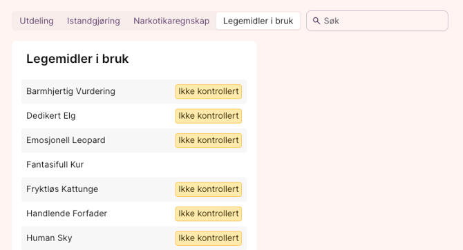 Legemiddeloppgaver gir en oversikt over status på ulike oppgaver og direkte snarveier til de. Det er fire faner: Utdeling, Istandgjøring, Narkotikaregnskap og Legemidler i bruk.