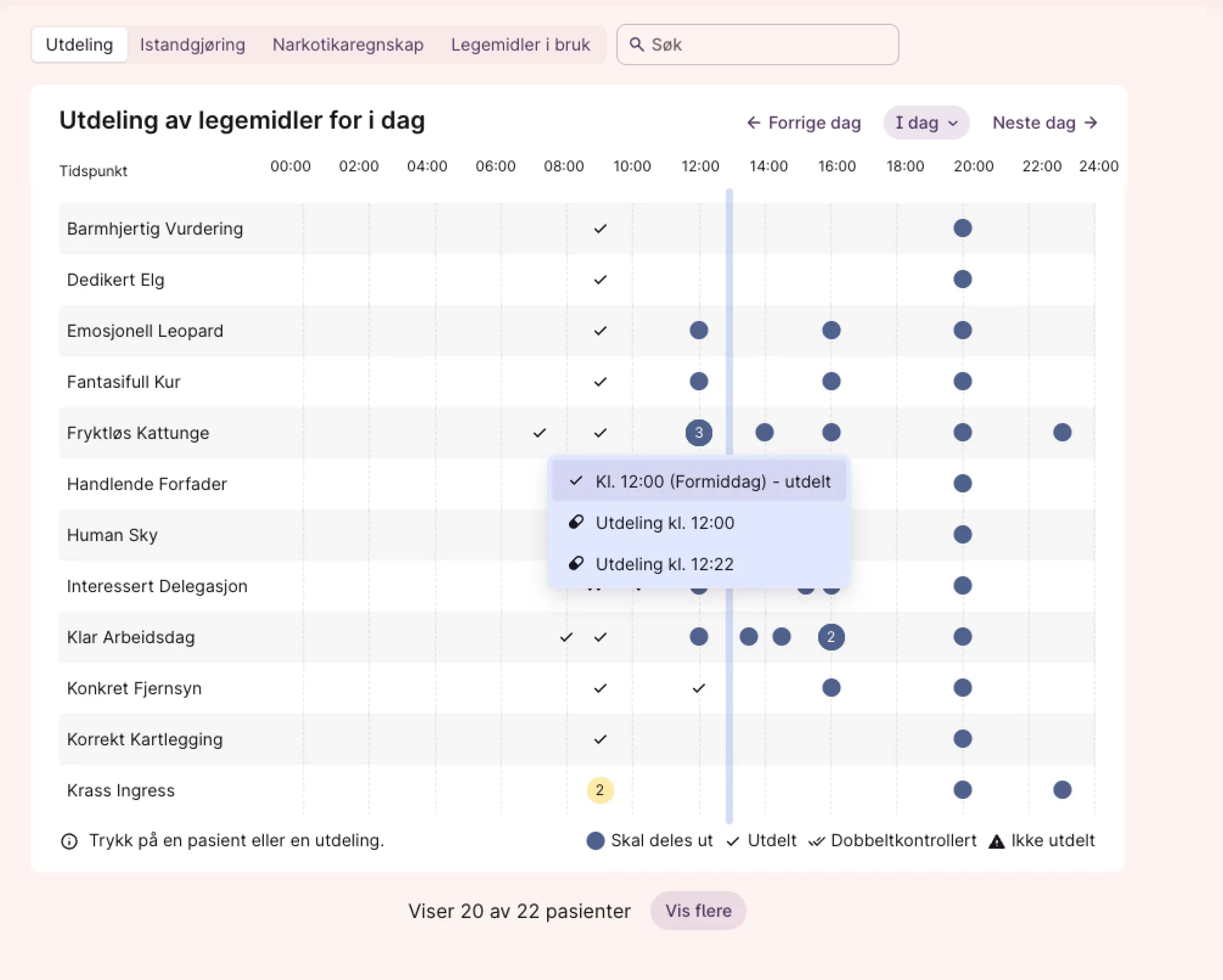 Utdeling lister alfabetisk ut alle pasienter og viser alle utdelingstidspunkt for en gitt dag.