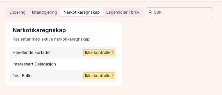 Narkotikakontroll-fanen lister kun pasienter med etablert narkotikaregnskap, altså de som har opprettet regnskap for minst ett A- eller B-preparat.