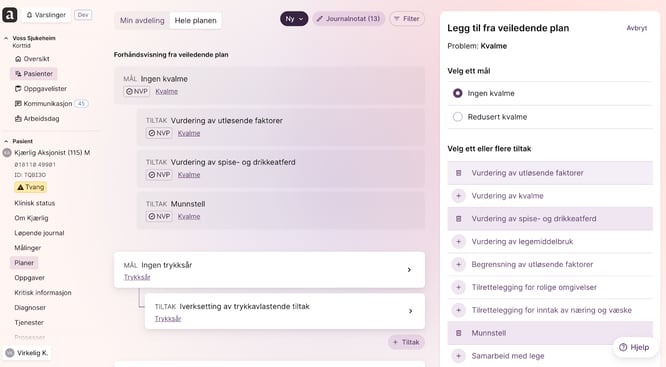 - Velg et relevant område for pasientens problemstilling. De foreslåtte målene og tiltakene vises automatisk.