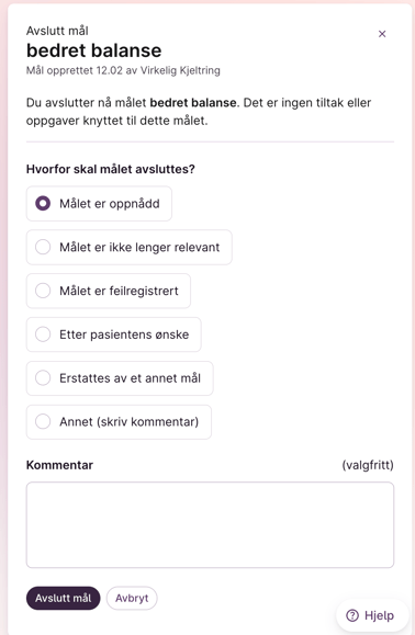 - Inne på et mål eller tiltak finner du “Avslutt” bak de tre prikkene.