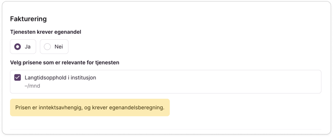 - Tildel tjeneste. Når man tildeler langtidsopphold til en innbygger, haker man av at tjenesten skal betales for. Dersom det er flere priser knyttet til tjenesten haker saksbehandler av alle som er relevant for pasienten.