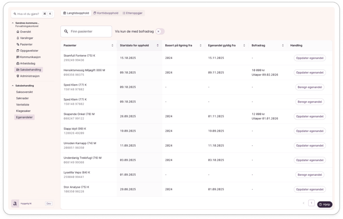 - Tjenesten har startet. Når pasienten har flyttet inn på sykehjem, og tjenesten er startet kan merkantil beregne egenandel for oppholdet. På siden “Egenandeler” er det en liste over alle pasienter med langtidsopphold (se bildet under). Her kan man holde oversikt over alle pasienter som har fått tildelt tjenesten, og når den eventuelt har startet opp.