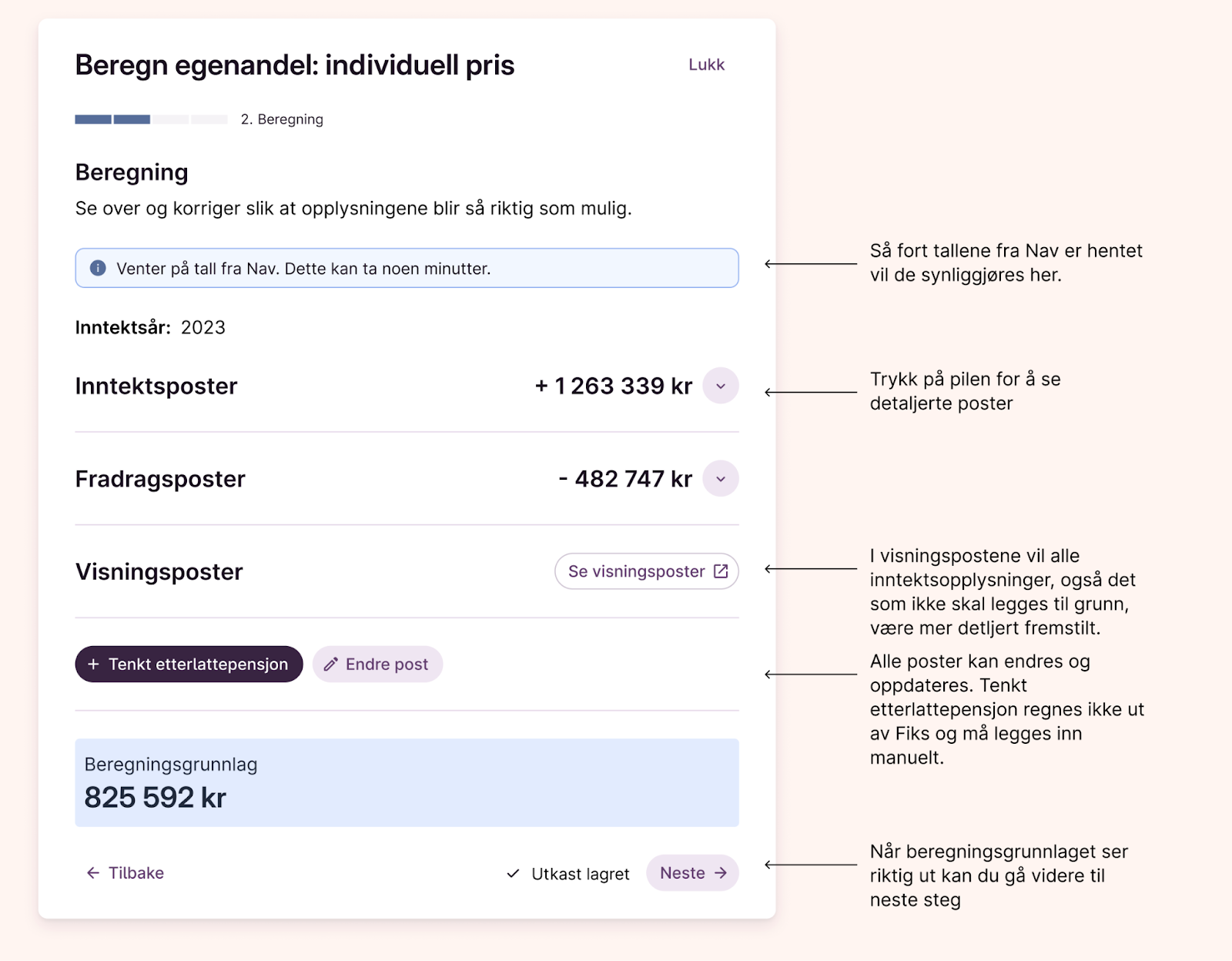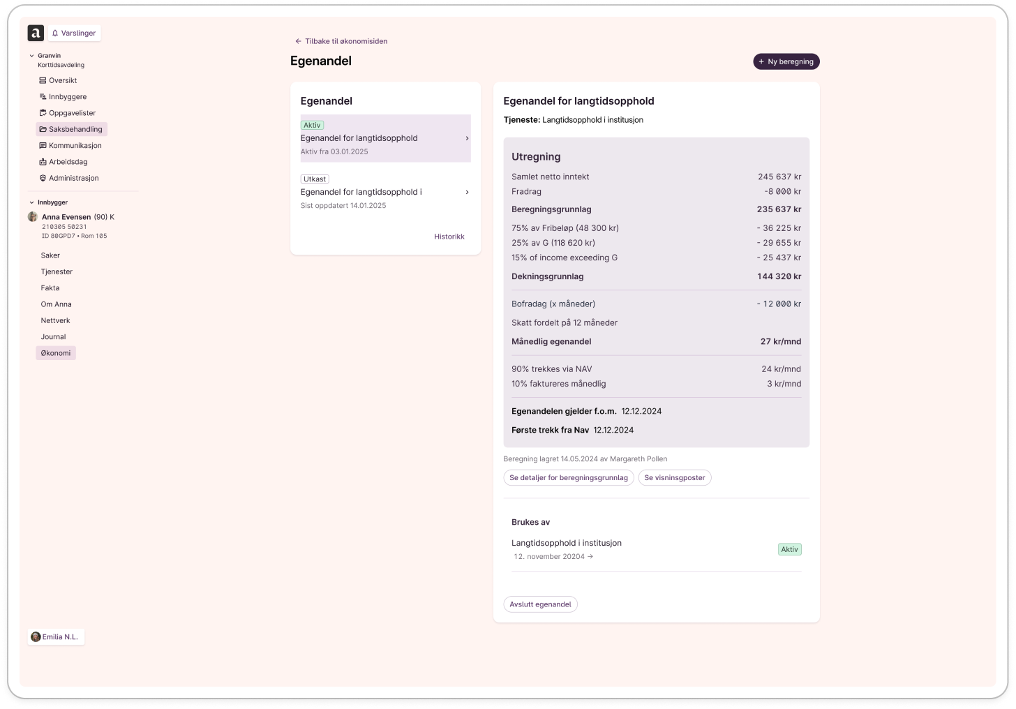 For å beregne egenandelen som skal betales for langtidsopphold, henter Aidn data fra Skatteetaten via Fiks, og inntektsopplysninger fra Nav. Justeringer og oppdaterte tall legges til slik at beregningsgrunnlaget blir så riktig som mulig. Aidn vil regne ut hva som er relevant egenandel per måned for denne tjenestemottakeren, og merkantil kan avgjøre hvor stor del skal trekkes direkte via Nav, og hvor mye det er hensiktsmessig at kommunen sender faktura på. Trekkmelding til Nav sendes når beregningen settes som aktiv.