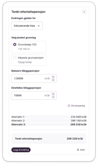 - Legg til tenkt etterlattepensjon. Tenkt etterlattepensjon følger ikke med tallene fra Fiks og må legges til manuelt. Hent tilleggspensjon fra inntektsopplysningene fra Nav, og fyll inn. Aidn vil regne ut de tre alternative resultatene for tenkt etterlattepensjon og velge den som er mest gunstig for pasienten.