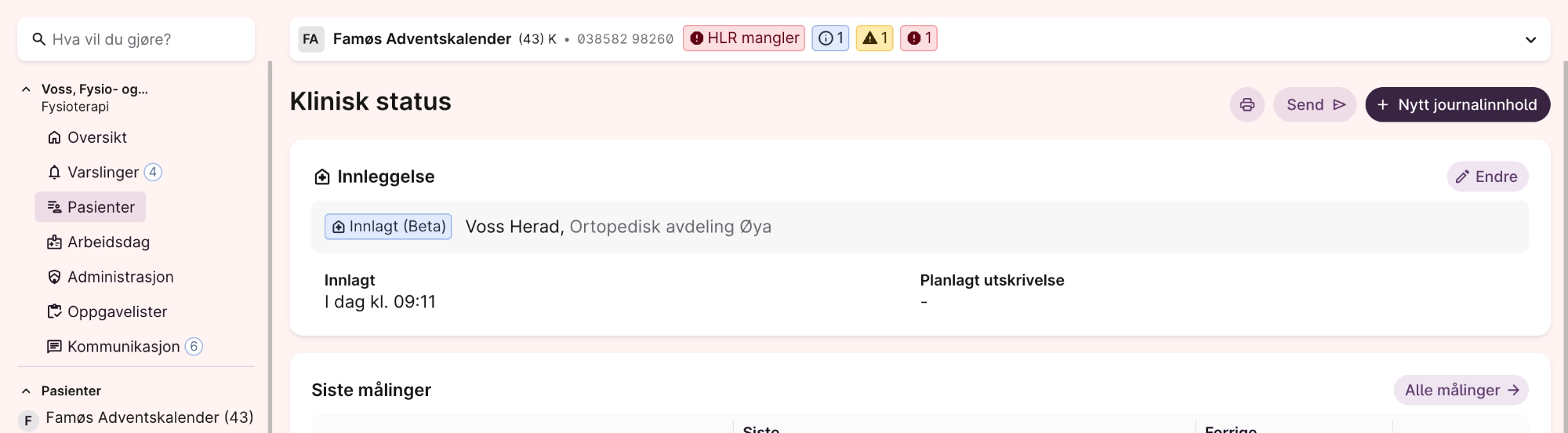 Pasientene på avdelingen din markeres som innlagt eller utskrivningsklar i pasientlisten. Du kan se mer informasjon om innleggelsen ved å klikke på pasienten og gå til «Klinisk status» eller «Kalender».