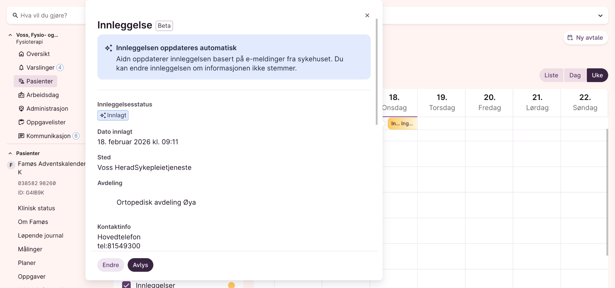Du kan registrere en innleggelse manuelt ved å opprette en ny avtale av typen «Akutt innleggelse» i pasientens kalender.