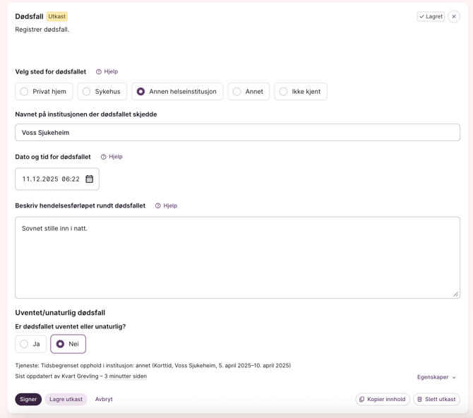 Når et dødsfall skjer i annen helseinstitusjon skal ansvarlig sykehjemslege utføre syning og rapportere dødsfallet til Folkeregisteret. Dette kan gjøres direkte fra Aidn ved å fylle ut skjemaet Melding om dødsfall. Dette skjemaet vil være tilgjengelig fra Ny-menyen og i dødsfallsprosessen dersom dødsfallet har skjedd i helseinstitusjon og personen er registrert som avdød.