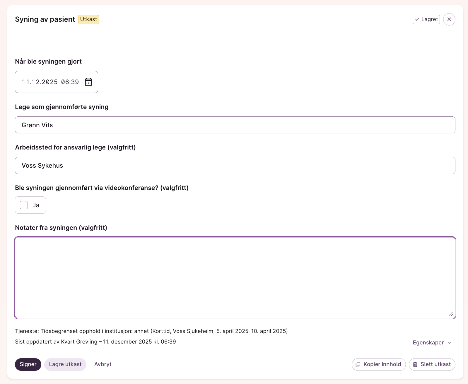 - Velg registreringen Syning av pasient og fyll inn informasjon om når syningen ble gjort, hvem som gjennomførte syningen og eventuelle notater eller merknader.