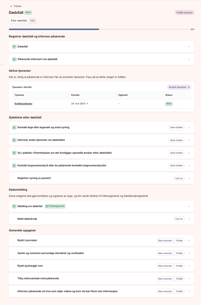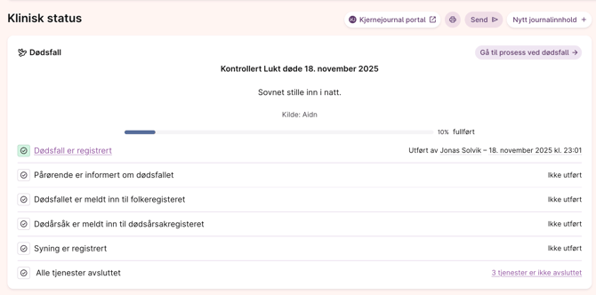 Denne prosessen består av en sjekkliste med oppgaver som ofte bør gjennomføres av helsepersonell etter dødsfallet. Sjekklisten tilpasser seg etter hvor dødsfallet ble registrert, slik at oppgaver som for eksempel syning og innsending av dødsmelding kun er synlig dersom dødsfallet skjedde på institusjon.