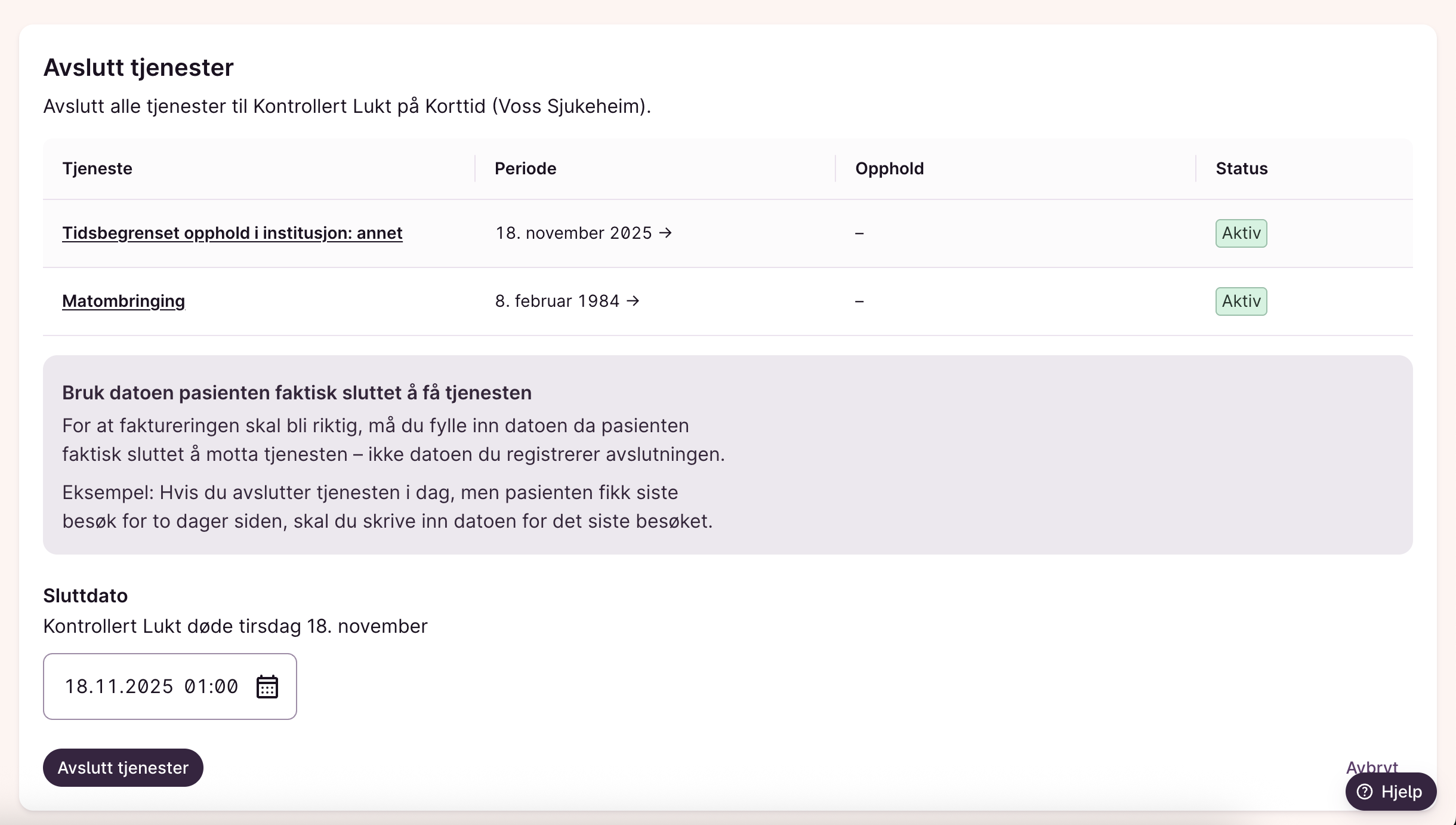 - Klikk på Avslutt tjenester til høyre for dødsfall på Om pasient eller Klinisk status