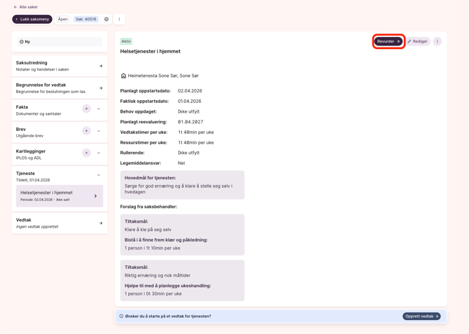 Du velger selv om du ønsker å skrive et nytt vedtak for den revurderte tjenesten. Dette gjør du ved å trykke på Vedtak i saksmenyen.