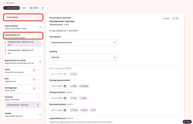 Når du revurderer en sak vil en ny versjon av saken opprettes automatisk. Du ser versjonene ved å åpne Sakshistorikk. I toppen på den nye versjonen kan du også se at du har startet en revudering.