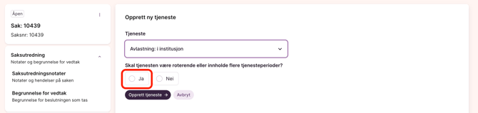 - Når du er inne på saken og klikker på “+ Tjeneste” og velger en av tjenestetypene i listen over, vil du få spørsmål om tjenesten skal være rullerende eller inneholde flere tjenesteperioder. Her kan du trykke på “Ja” om du ønsker å tildele mer enn ett opphold på samme tjeneste. Trykk “Nei” dersom du kun skal tildele ett opphold.