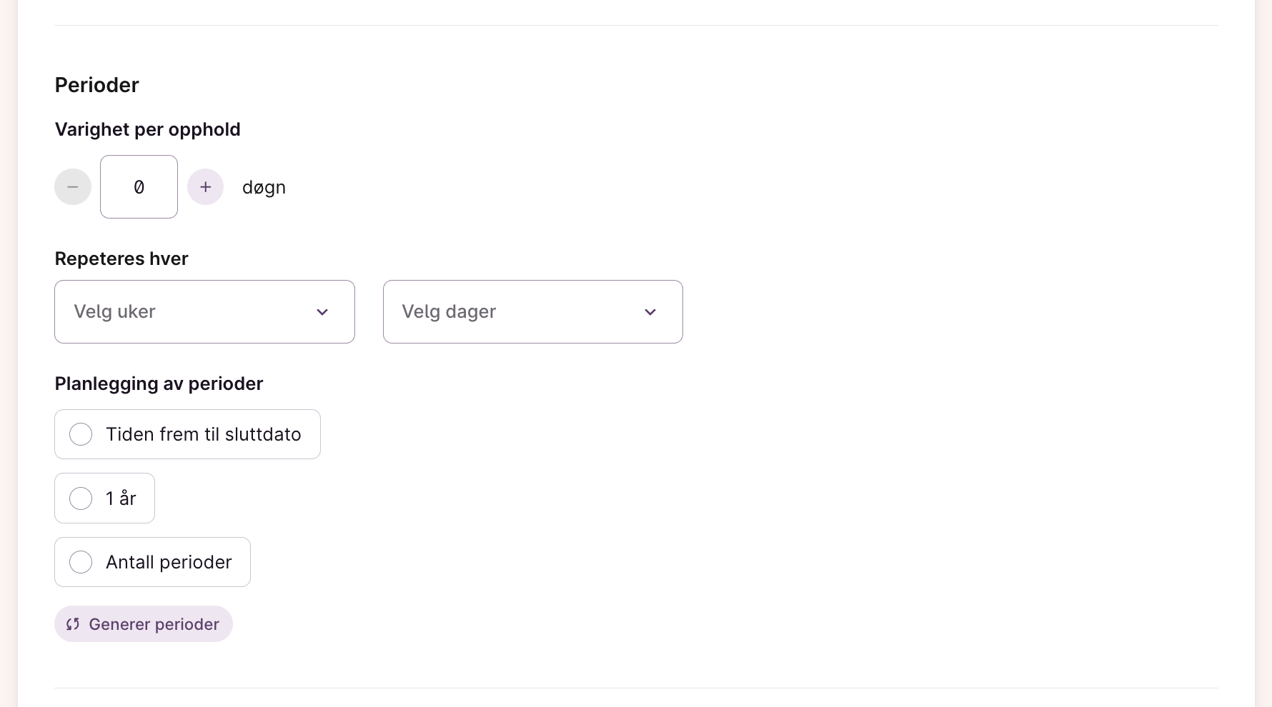 Skjermbilde: Under perioder fyller du inn informasjon om periodene du ønsker å generere. - Når du har fylt inn instruksjonene for periodene du ønsker å generere kan du trykke på “Generer perioder”.
