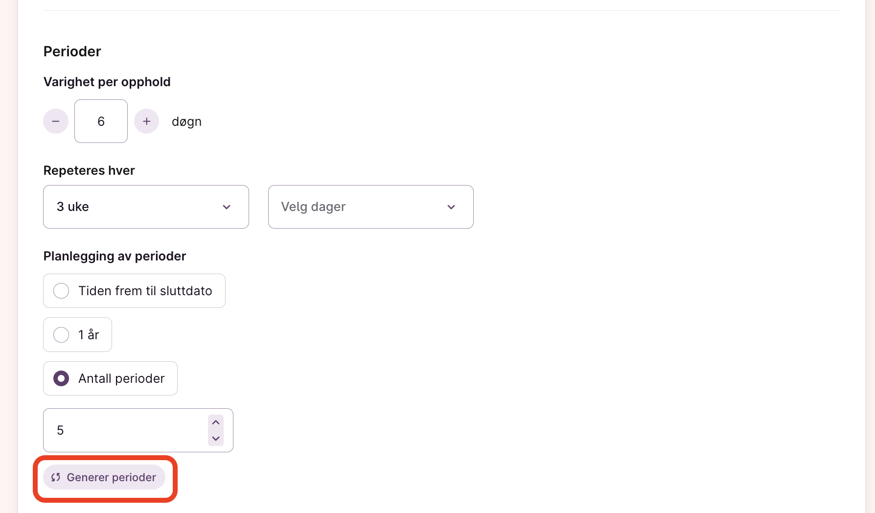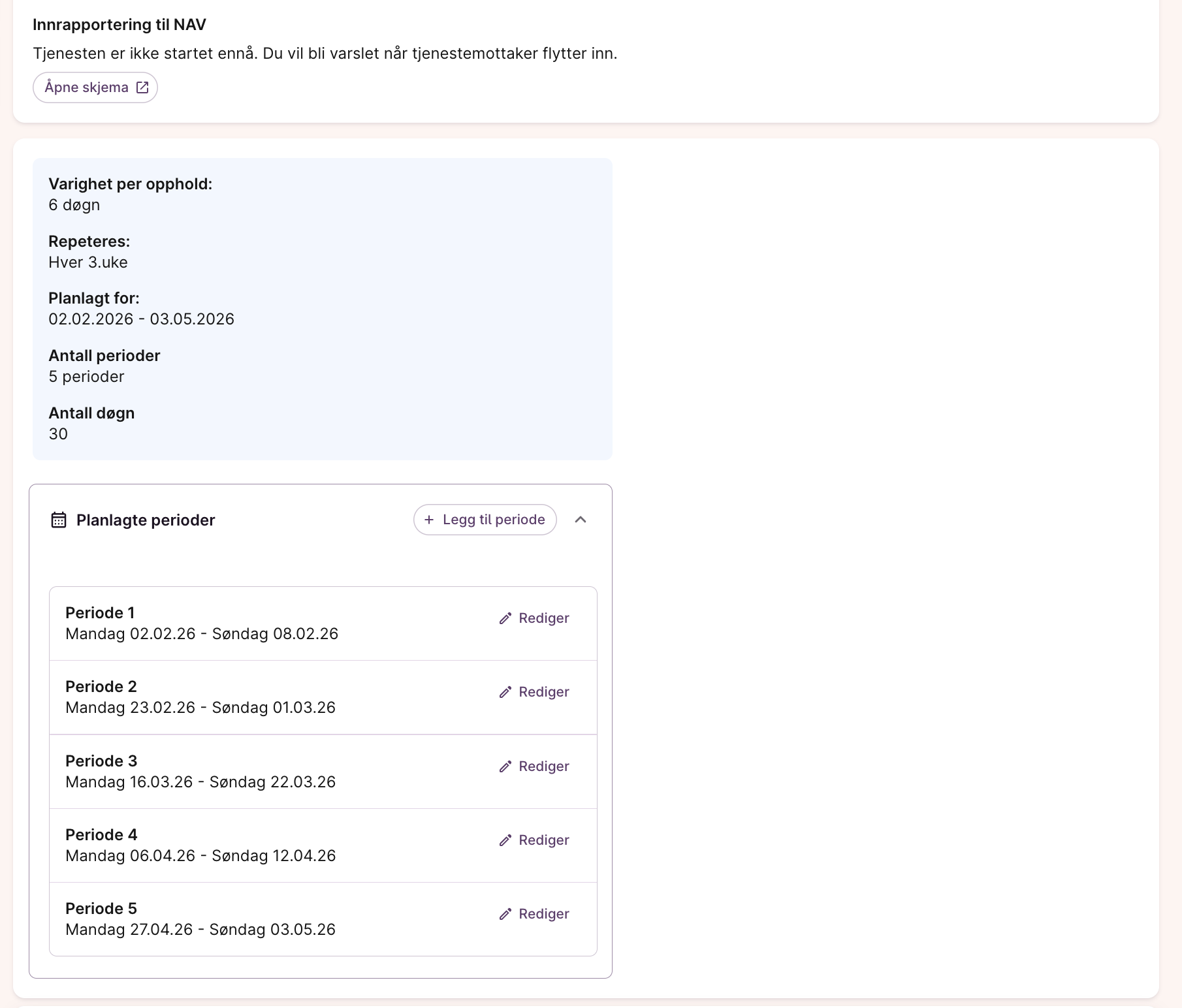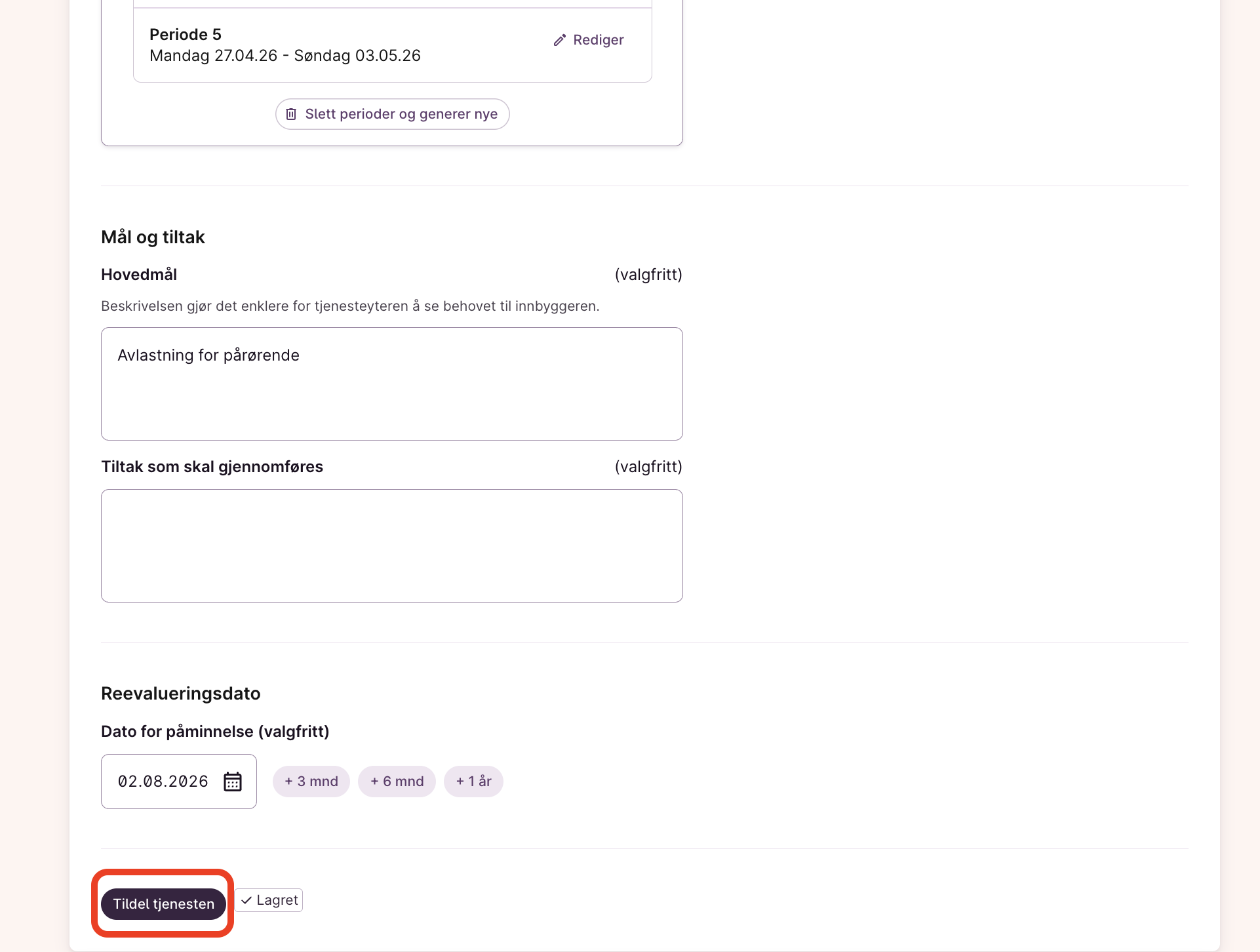 Når du har valgt at tjenesten skal være rullerende eller inneholde flere opphold vil du se seksjonen “Perioder” dukke opp på tjenesten du skal tildele. Her kan du velge hvor lang hver periode skal være, hvor ofte den skal repeteres, og hvor mange perioder du ønsker å planlegge for. Dersom du velger å planlegge til tiden frem til sluttdato må en sluttdato være satt for tjenesten.
