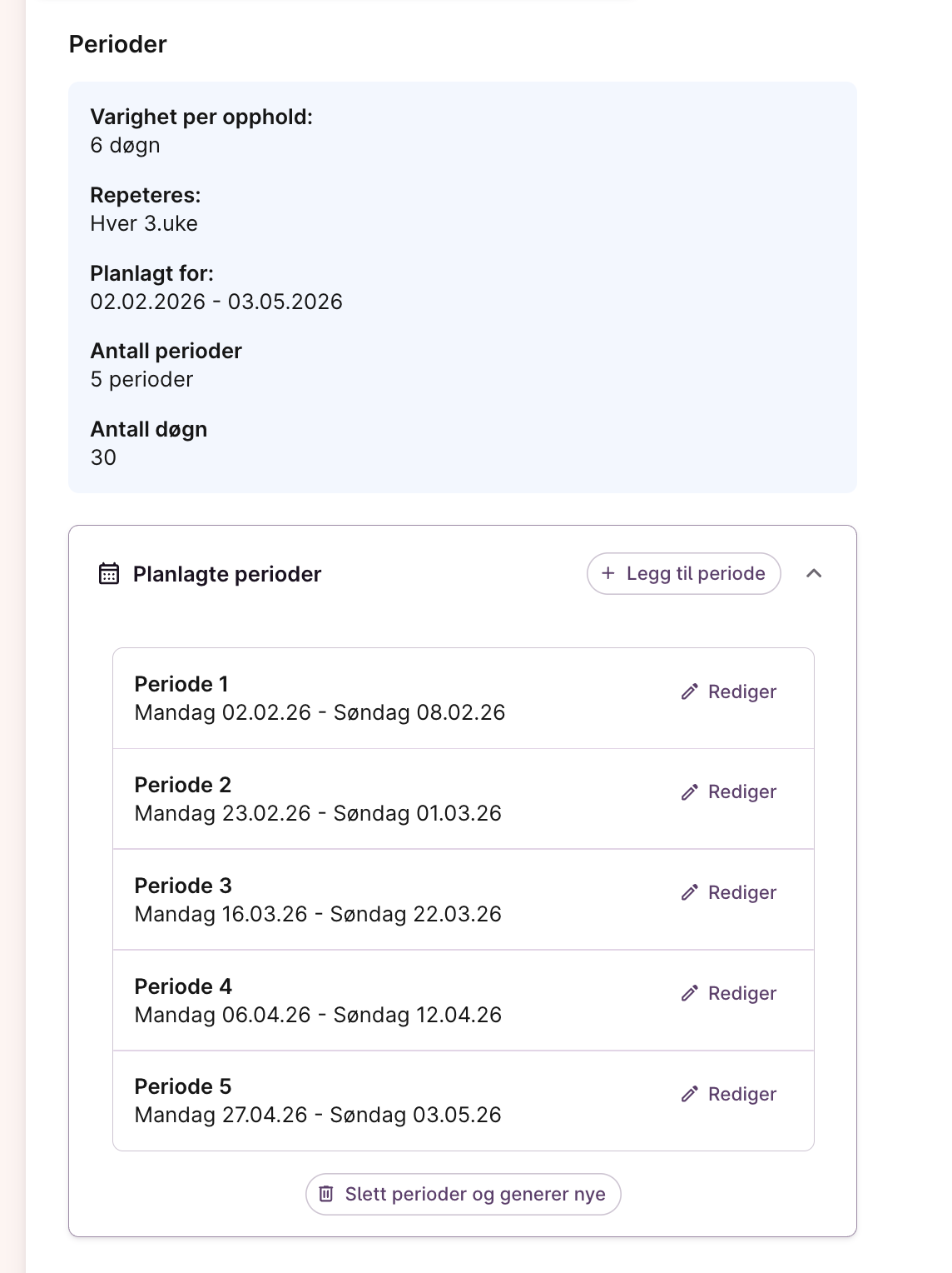Dersom du ikke er fornøyd med planen kan du trykke på “rediger” for å slette eller redigere en enkeltperiode, eller så kan du legge til flere perioder ved å trykke “+ Legg til periode”. Ønsker du å slette alle periodene kan du klikke på “Slett perioder og generer nye” nederst i listen. Du blir da tatt tilbake til planleggingen av nye perioder og kan endre på instruksjonene du har satt, og generere nye.