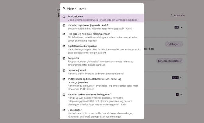 - Skriv inn det du ønsker mer informasjon om. For eksempel kan du søke etter "avvik", og få disse resultatene: