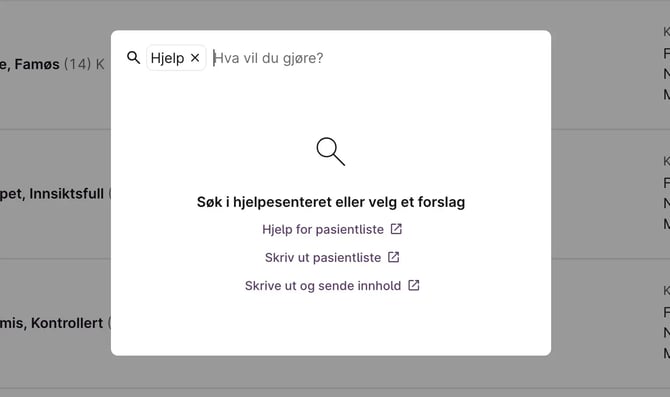 Søkefeltet kan også hjelpe deg ved å foreslå relevante hjelpeartikler basert på hvor du er i Aidn. Dersom du for eksempel befinner deg på pasient-siden, vil du kunne få disse forslagene: