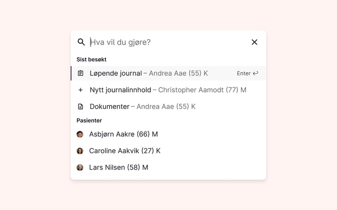 - Begynn å skrive – resultatene grupperes automatisk etter type (pasienter, sider, handlinger)