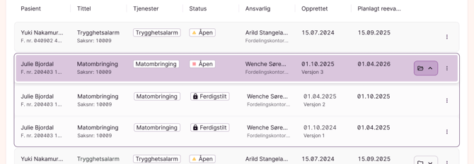 Vi har gjort det enkelt å se alle versjonene av en sak. Dersom en sak som vises i listen har flere versjoner, kan du åpne saken i listen ved å klikke på knappen med mappe-ikonet for å se de tilhørende versjonene.