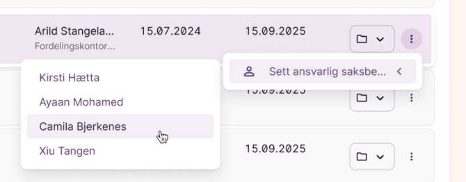 Ved behov kan man fra oversikten endre ansvarlig saksbehandler fra tre-prikks-menyen helt til høyre på hver sak i listen. Når du trykker på denne får du opp en meny med oversikt over tilgjengelige saksbehandlere, og velger ny saksbehandler ved å klikke på den som måtte være aktuell å bytte til.