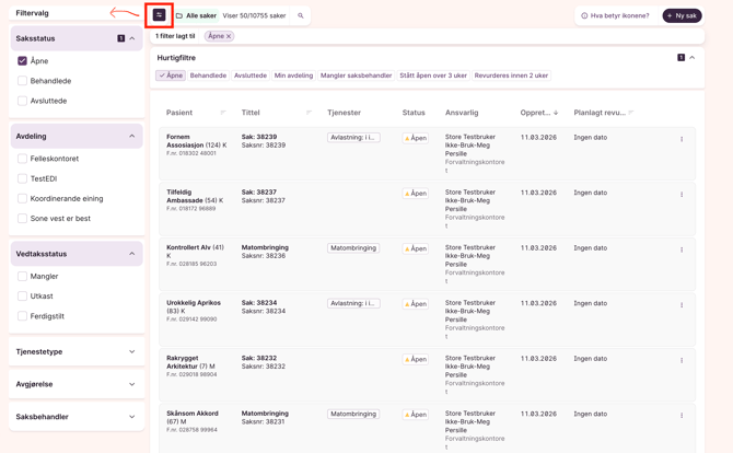 Vil du se noe annet? Du kan enkelt endre filteret under Saksstatus og velge: fjerne filteret å legge til nye fra filtermenyen eller hurtigfiltermenyen.