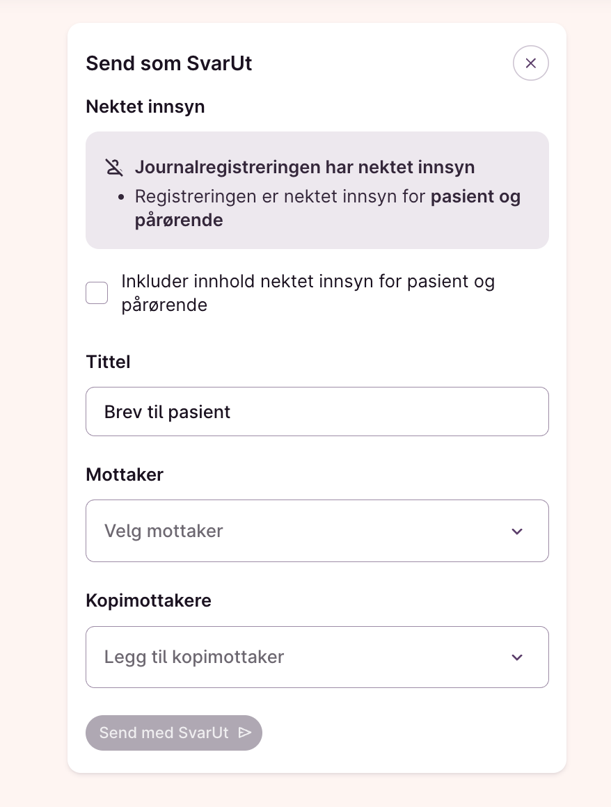 Du kan ikke sende dokumenter der pasienten har nektet innsyn, som brev til pasienten eller pårørende. Dersom pasienten er nektet innsyn til dokumentet du ønsker å sende får du en advarsel om dette.