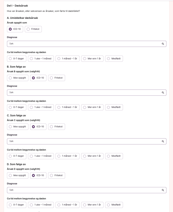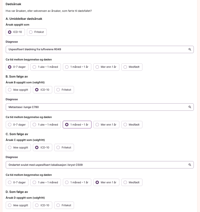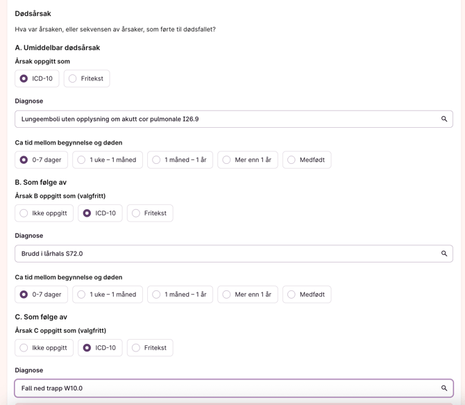 💡For å få riktig dødsårsak er det viktig at diagnosene blir lagt inn i riktig rekkefølge. Hendelsesførløpet for dødsfallet registreres ved å fylle ut sekvensen av diagnoser som førte til dødsfallet.