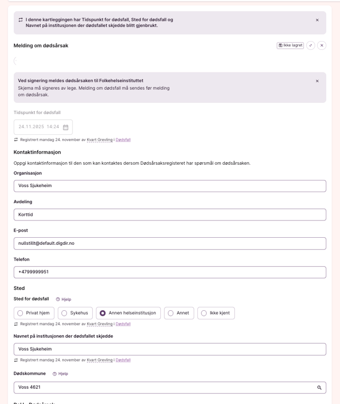 Kontroller at tidspunkt, dødssted og dødskommune er korrekt utfylt. Denne informasjonen er gjenbrukt fra dødsfallregistreringen.