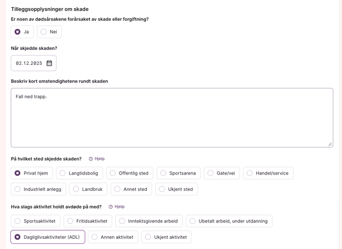 Man blir bedt om å ta stilling til om dødsfallet er forårsaket av en skade eller forgiftning (ytre årsak). I slike tilfeller velger man ja i tilleggsopplysninger om skade og får da nye felter som fylles i med informasjon om skaden.