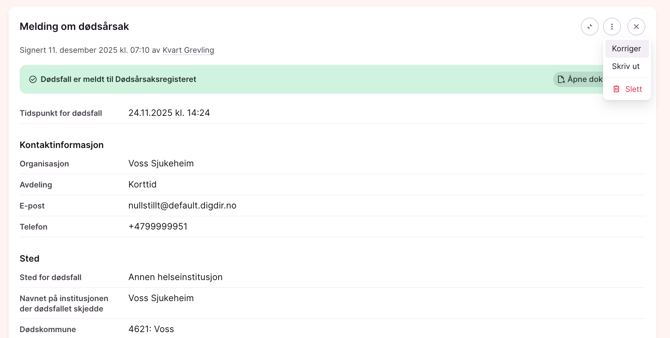 - Korrigering av annulering av melding sendes automatisk til Dødsårsaksregisteret.