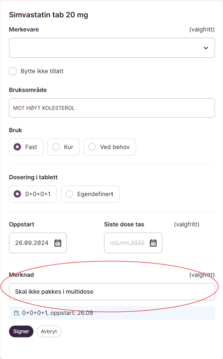 For å kommunisere til apotek at enkelte legemidler ikke skal multidosepakkes så skal lege ved ordinering angi at legemiddel ikke skal pakkes. Dette angis i tilknytning til å angi dosering av legemiddelet.
