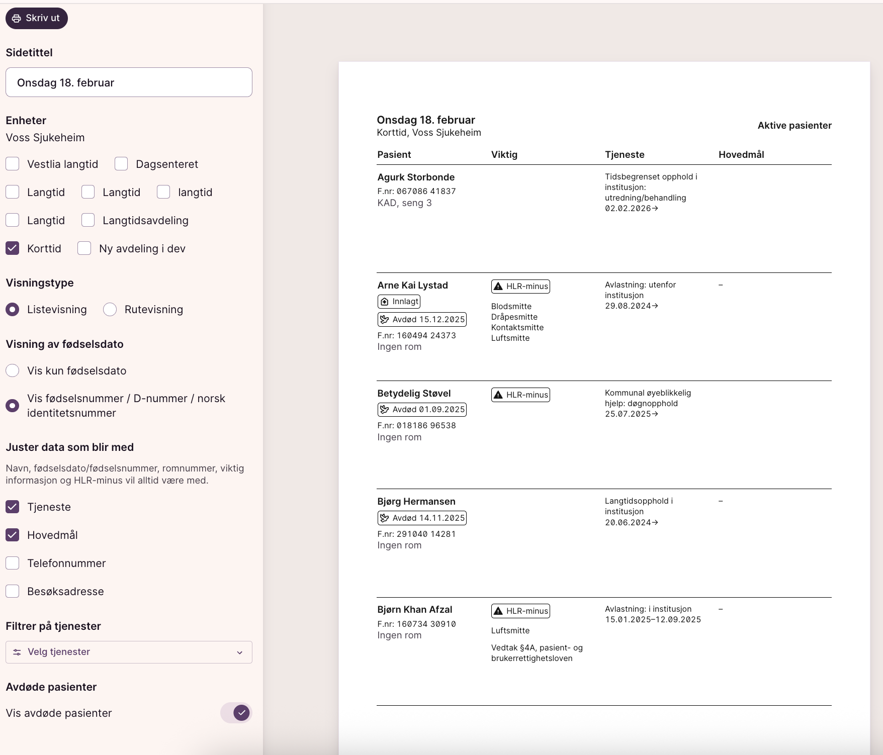 - Velg hvilke enheter du vil skrive ut pasienter fra