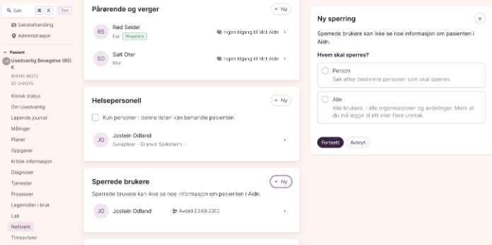 Sperrefunksjonen i Aidn gjør det mulig å begrense tilgang til pasientinformasjon slik at kun spesifikke helsepersonell får tilgang. Alle andre blir blokkert.