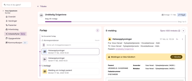 ℹ️ Automatisk registrering av sykehusinnleggelser er under utvikling og testes i utvalgte kommuner. Foreløpig er denne funksjonaliteten kun tilgjengelig i Hole, Hadsel og Voss.