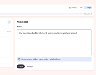 Opprett et internnotat ved å klikke på menyknappen ved siden av “Forløp”. Notatet er kun til intern koordinering i forbindelse med sykehusinnleggelsen, og blir ikke ført inn i pasientens journal. Alle som har tilgang til pasienten og arbeidsflyter kan se notatet.