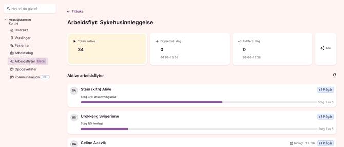 ℹ️ Oversikt over sykehusinnleggelser i Arbeidsprosesser er under utvikling og testes i utvalgte kommuner. Foreløpig er denne funksjonaliteten kun tilgjengelig for utvalgte brukere.