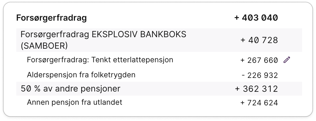 Aidn vil bruke den tenkte etterlattepensjonen til å regne ut forsørgerfradraget. Her vil vi trekke fra partners inntekt og 50% av pasientens andre pensjoner.