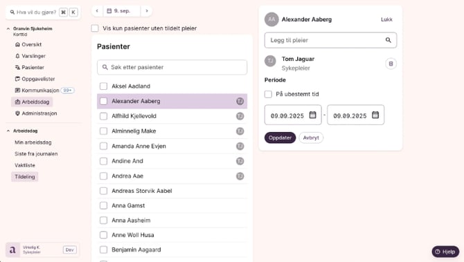 - I tildelingslisten (du finner den også i pasientlisten oppe til høyre), velger du pasientene som skal følges opp av samme pleier.