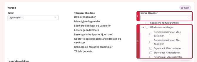 - Utvid seksjonen “Håndtere e-meldinger” og velg hvilke tilganger brukeren skal ha i tillegg til de som eventuelt følger rollen.