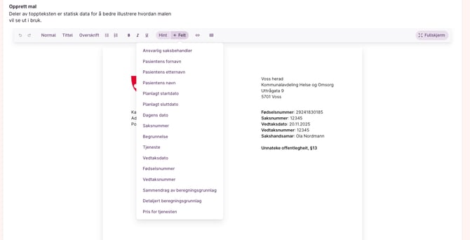 Når de bygger malene vil de kunne legge til felter som automatisk henter riktig data når brev og vedtak ferdigstilles.