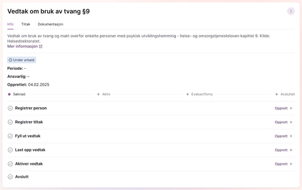 Du kan registrere flere tiltak ved å trykke på ”Opprett +“ en gang til. Denne informasjonen blir en del av det ferdige vedtaket.