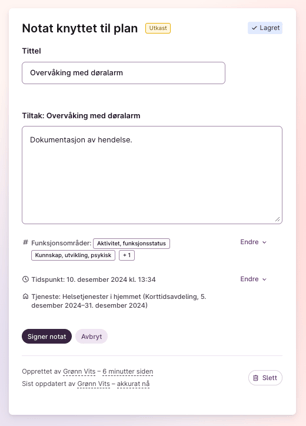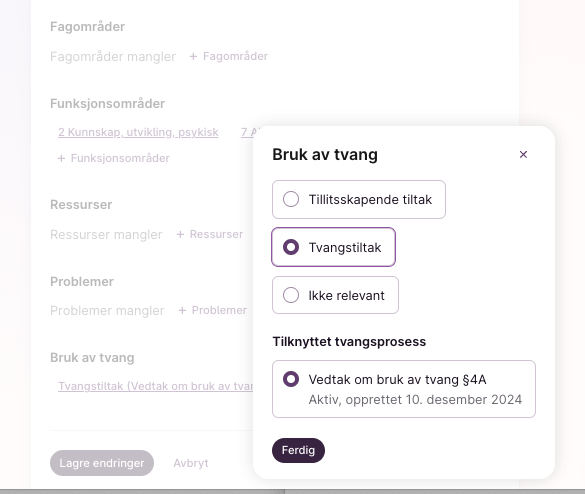Dokumentasjon av helsehjelp som er utført med tvang skal gjøres fra planverktøyet.